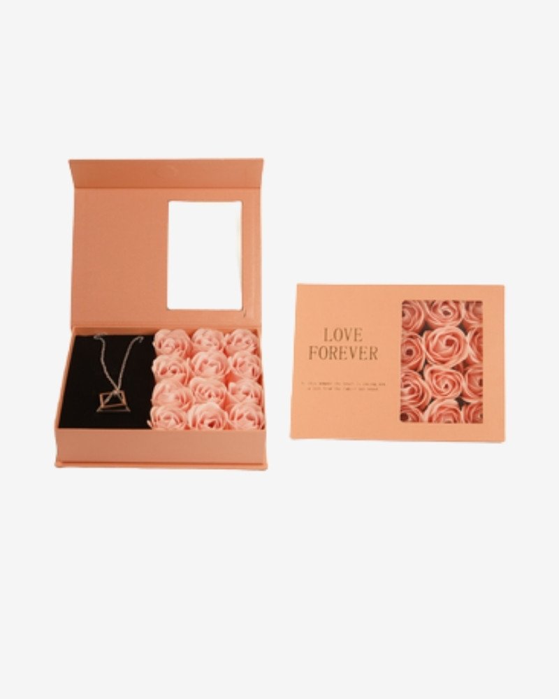 Caja de regalo «LOVE FOREVER» que combina la belleza de las flores con un elegante collar fantasía para mujer. Un detalle romántico y sofisticado.