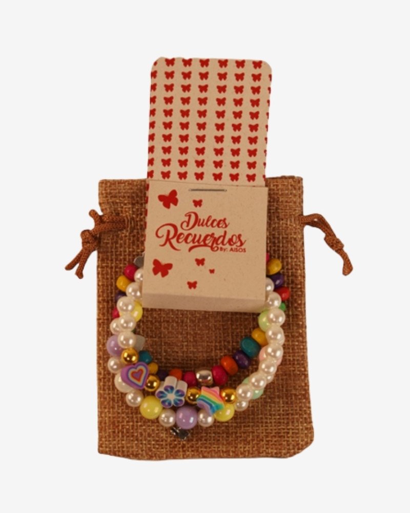 Simpático bolso de yute con pulseras de cuentas y perlas de colores para niñas. Decoradas con motivos de flores, corazón, estrellas y un arcoíris. Un accesorio divertido y colorido.